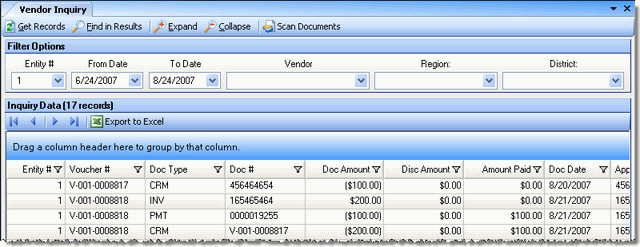 The Vendor Inquiry screen allows you to view vendor activity for a date or date-range, for a particular vendor or all vendors. This includes vouchers (invoices and manual checks) and any associated payments or credit memos. For example, you might use the Vendor Inquiry screen to check whether a particular invoice was paid, or to see how much a vendor is owed and which vouchers are outstanding.