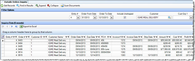 The Outside Orders Inquiry screen allows you to view Outside Order activity