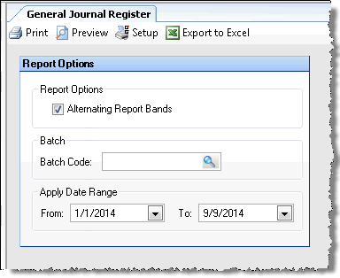 Batch Code Optionally select a batch code to generate the register from a single general journal batch. If you do not specify a batch code, all general journal batches that fall within the date range will be included on the report.