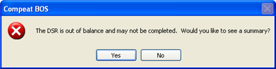 The system verifies whether the debits and credits are equal (that is, whether the DSR balances). If it does not balance, a message similar to the following displays: