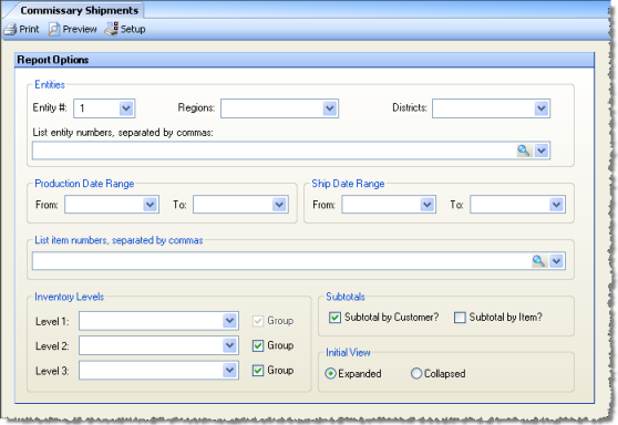 The Commissary Shipments report lists all items that have been shipped in any date range, and/or produced in any date range. Used in conjunction with the Production Date field in the detail area of the Outside Orders screen, this report can identify which items were produced on which dates and shipped to which customers. This data can then be used to support a product recall process, if necessary.