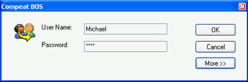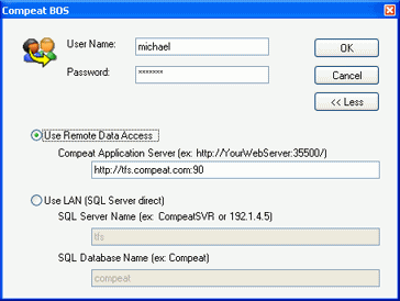 When you start Compeat, you are prompted to log in to the system with a User Name and Password. Basic configurations to the server, including login information should be made during installation. Once these have been set, you can simply enter your user name and password to continue.